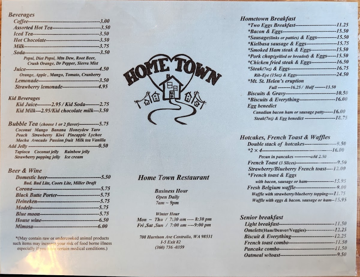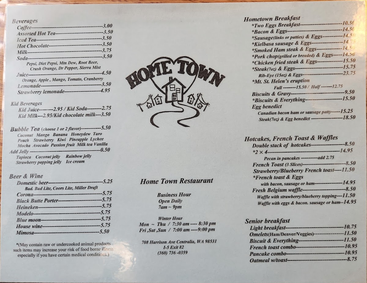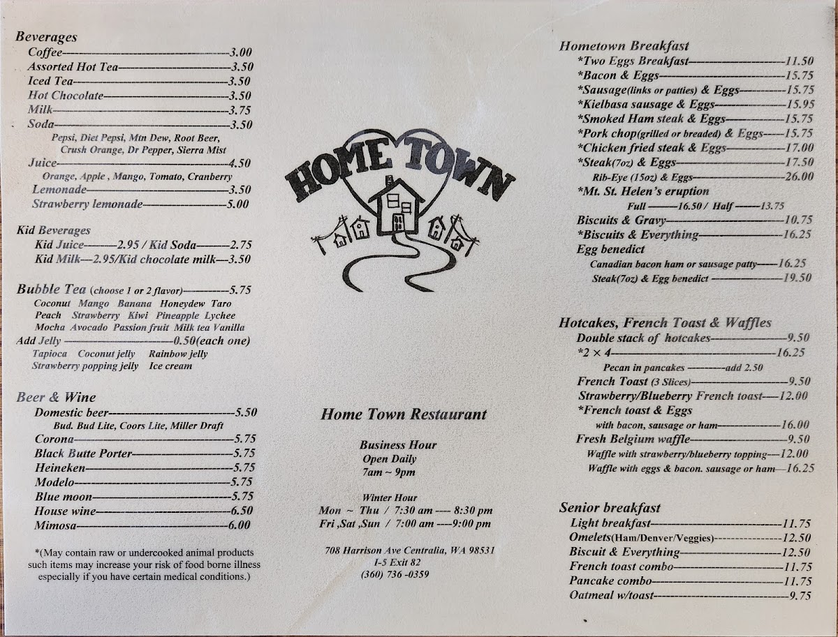 Welcome to Hometown Restaurant, located at 708 Harrison Ave, Centralia, WA, where cozy ambiance meets mouthwatering flavors. This beloved pho restaurant has garnered rave reviews for its hearty menu, beginning with standout breakfast options like the Mt. St. Helens breakfast and their famous ham and eggs.